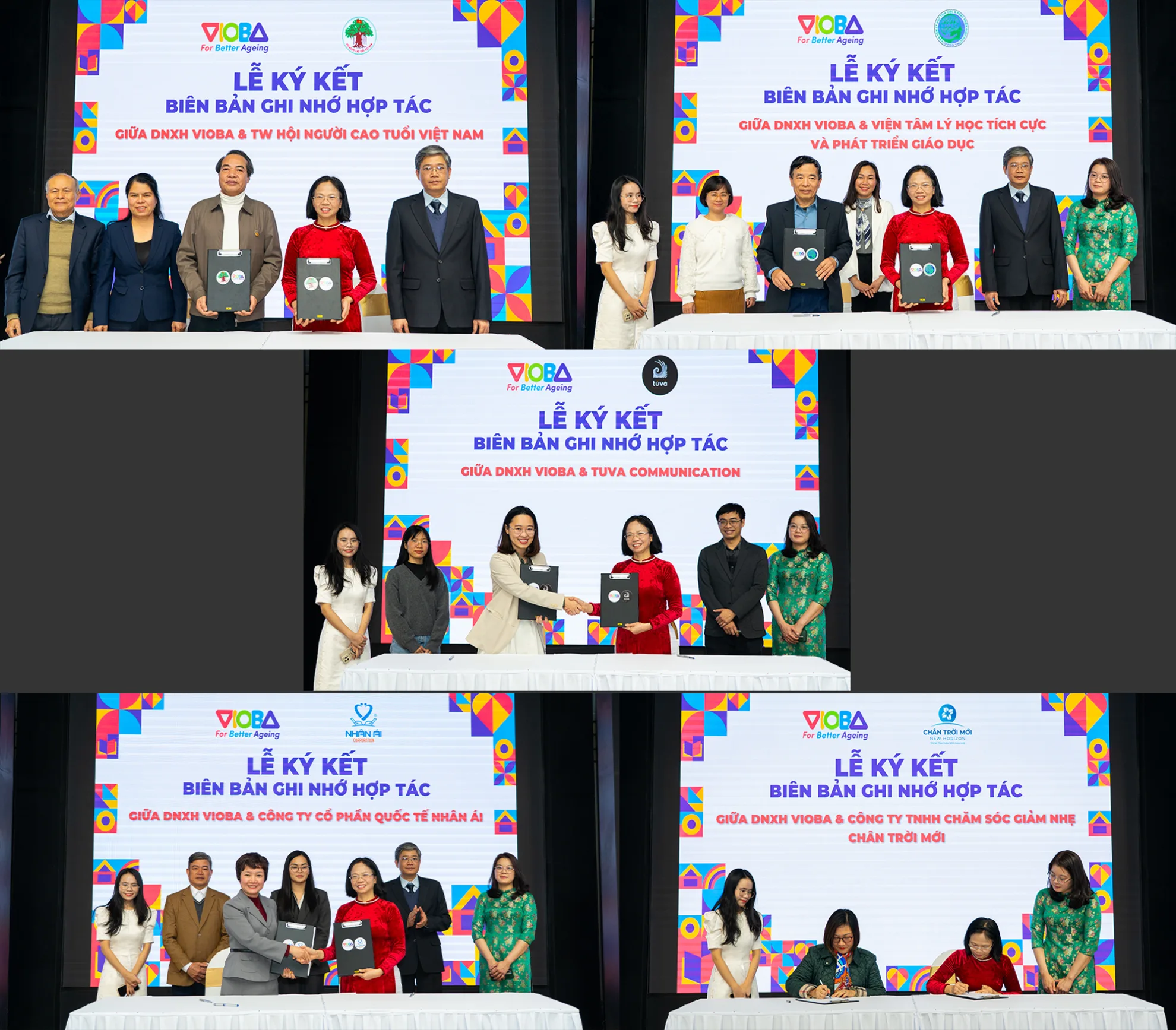 Sự kiện ra mắt cũng chứng kiến lễ ký kết biên bản ghi nhớ hợp tác giữa VIOBA với các đối tác chiến lược, bao gồm Trung ương Hội Người cao tuổi Việt Nam, Công ty Cổ phần Quốc tế Nhân Ái, Công ty TNHH Chăm sóc Giảm nhẹ Chân trời mới, Công ty Truyền thông Tuva Communication, và Viện Tâm lý học tích cực & Giáo dục Phát triển, mở ra các cơ hội hợp tác dài hạn trong các hoạt động tư vấn, nghiên cứu, truyền thông và triển khai mô hình.